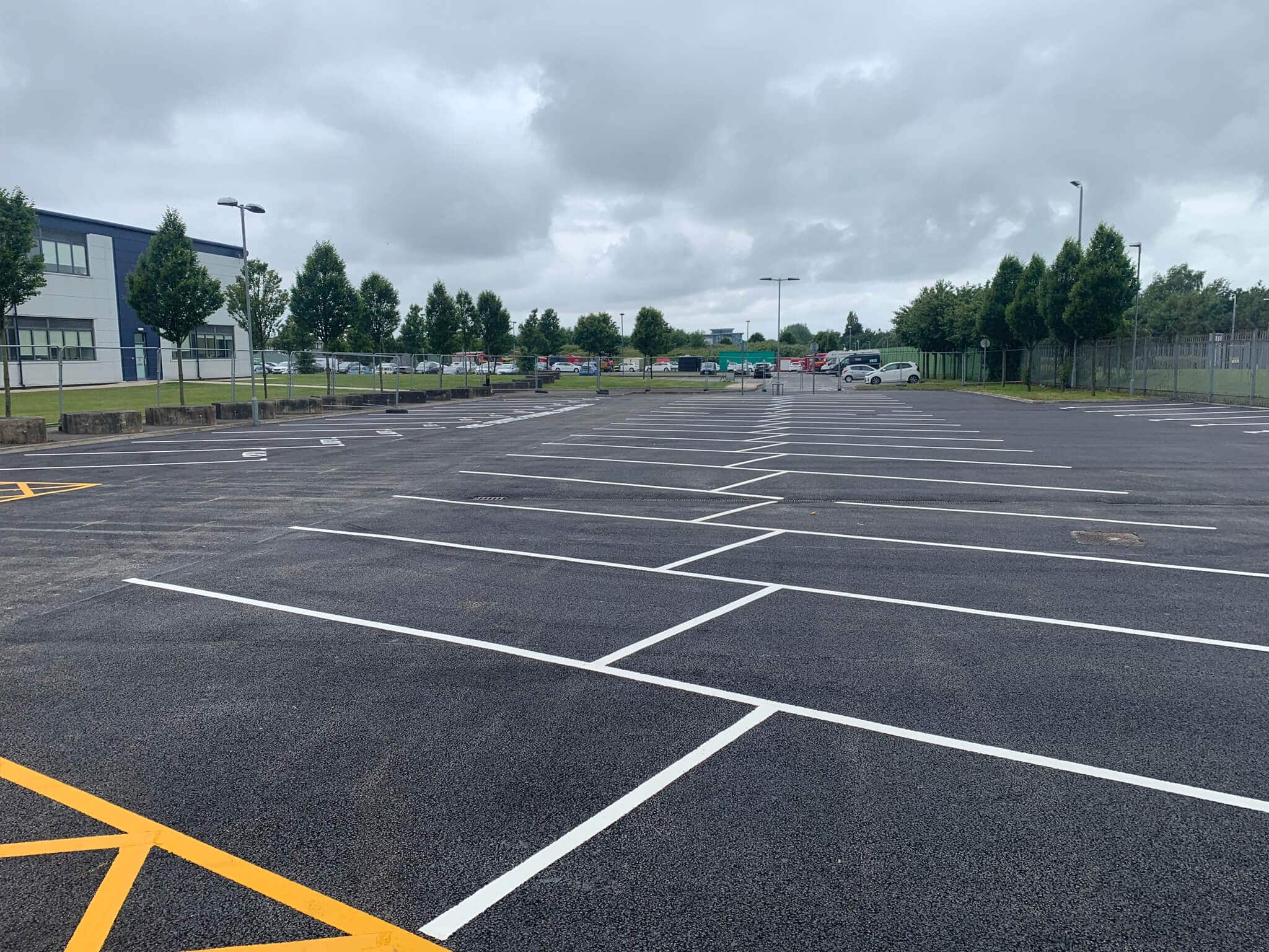 The scope of work included resurfacing the area with tarmacadam, redesigning the drainage system, and applying thermoplastic lining to enhance the parking layout.